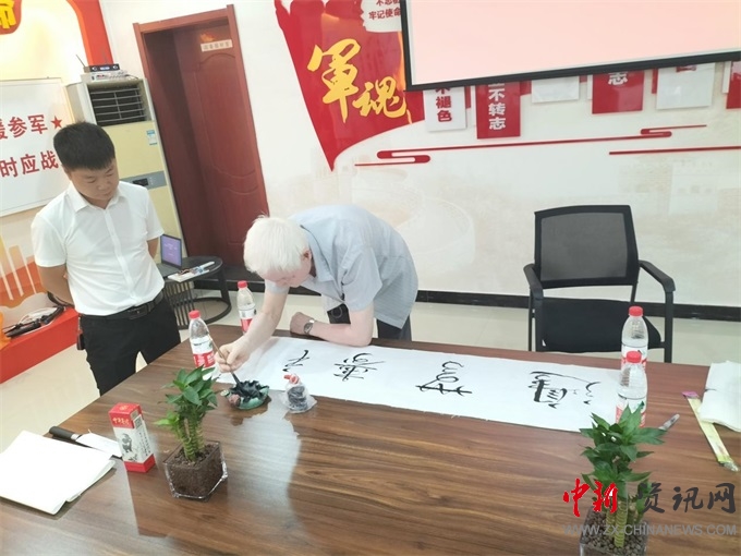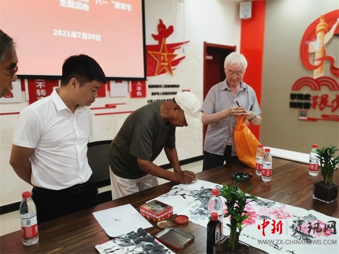 文藝表演在優(yōu)美的舞蹈中拉開帷幕,F(xiàn)年80高齡的退役軍人孫景當(dāng)場(chǎng)提筆、一揮而就“福壽無邊”蒼勁有力,兩參老兵梁國(guó)富送來的“花開富貴”牡丹圖,為節(jié)日增添了濃濃的文化氛圍。