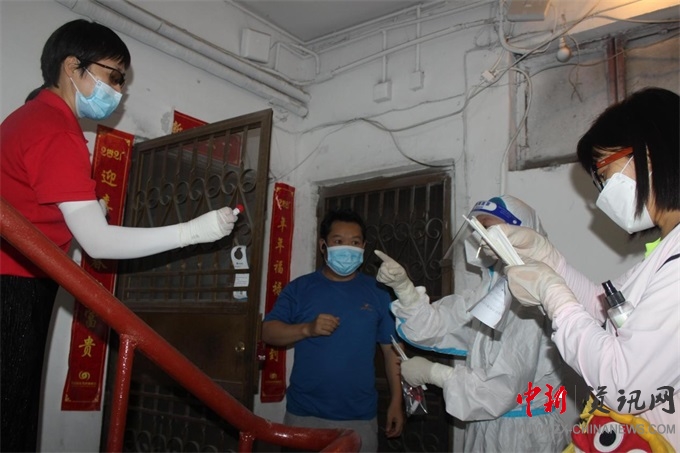 醫(yī)務(wù)人員穿著防護(hù)服,佩戴好手套、口罩、護(hù)目鏡,在社區(qū)工作人員的帶領(lǐng)下到居家隔離人員家中進(jìn)行核酸檢測采樣工作。核對身份信息、咽拭子采集、酒精消毒,整個(gè)過程有條不紊。此外,社區(qū)工作人員堅(jiān)持每日前往居家隔離人員家門前進(jìn)行消毒消殺工作。