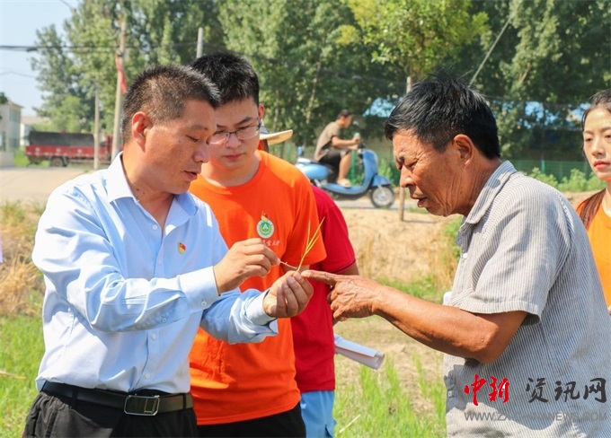 儀式結(jié)束后,在崔慧敏、吳穎賓的帶領(lǐng)下,農(nóng)大師生一行前往土柏崗鄉(xiāng)崗西社區(qū)進(jìn)行科技指導(dǎo)。到達(dá)田間后,師生同種植戶進(jìn)行親切的交談,“這片玉米為什么長不高?地里的草怎么有效解決?”眾多群眾帶著困擾已久的問題前來尋求幫助,王永華、彭延教授仔細(xì)聆聽,耐心一一解答。由于咨詢?nèi)罕娸^多,在社區(qū)委員會開展農(nóng)業(yè)技術(shù)培訓(xùn)講座,現(xiàn)場發(fā)放宣傳冊及捐贈農(nóng)藥。