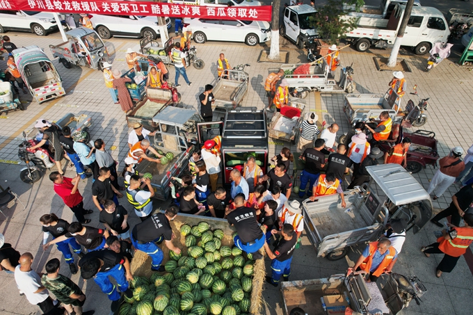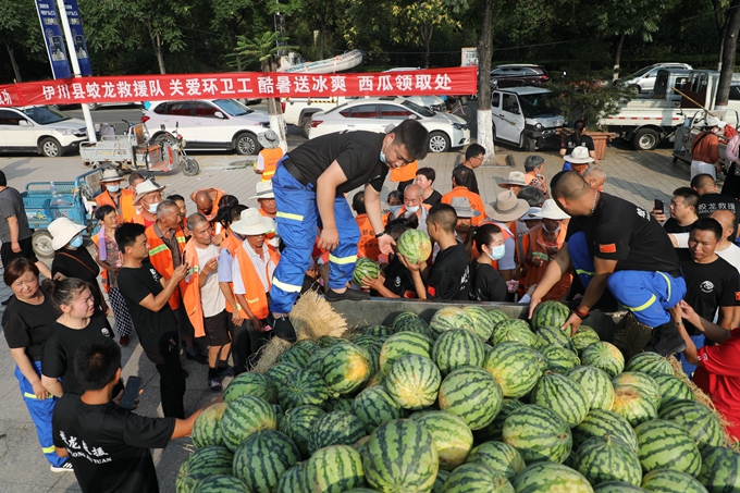 酷夏送冰爽:伊川蛟龍救援隊連續(xù)5年為環(huán)衛(wèi)工送西瓜