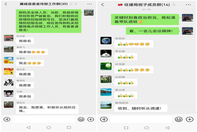 “我去!”“我愿意!”“隨時(shí)聽取調(diào)遣!”……當(dāng)黨員干部就地轉(zhuǎn)為志愿者的倡議書剛剛發(fā)出后,不過幾分鐘的時(shí)間里,襄城各單位的工作群瞬間“熱”了,大家踴躍報(bào)名的信息如潮水一般,一條條跳動(dòng)的信息不僅是他們赤誠(chéng)的心聲,更是他們保衛(wèi)家鄉(xiāng)、同心戰(zhàn)疫的堅(jiān)定信心!最終,襄城從無數(shù)報(bào)名的黨員干部中挑選出73名優(yōu)秀代表組成第一批志愿團(tuán)隊(duì),前往分包集中隔離點(diǎn)支援,與廣大醫(yī)護(hù)人員共同筑起一道“紅色防線”。