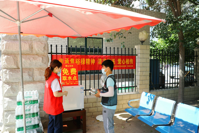 活動(dòng)中,分局組織干部職工自發(fā)籌集愛(ài)心款項(xiàng)用于買(mǎi)清涼物資,在北門(mén)西側(cè)為奮戰(zhàn)在高溫一線的環(huán)衛(wèi)工人、外賣(mài)配送者、快遞員等免費(fèi)提供降溫茶水、清涼物品,并開(kāi)通“愛(ài)心驛站”,提供休息座椅、遮陽(yáng)傘等;同時(shí)和環(huán)衛(wèi)工人、外賣(mài)配送人員等開(kāi)展交流,了解他們?nèi)粘9ぷ鞯膬?nèi)容與辛苦。