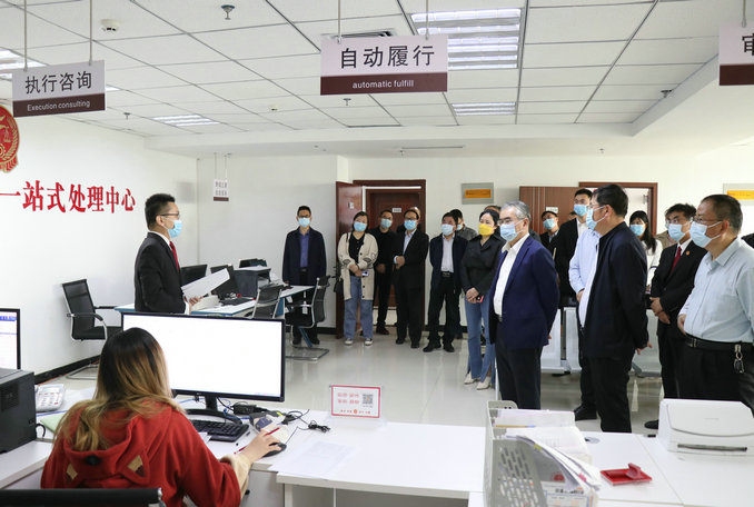 張寶生一行對(duì)魏都區(qū)法院執(zhí)行“996”工作模式進(jìn)行詳細(xì)了解,還對(duì)這種由執(zhí)行指揮中心集中辦理九類(lèi)事務(wù)性工作,承擔(dān)九項(xiàng)管理職責(zé),提供六類(lèi)技術(shù)服務(wù)的模式進(jìn)行了現(xiàn)場(chǎng)查看體驗(yàn)。