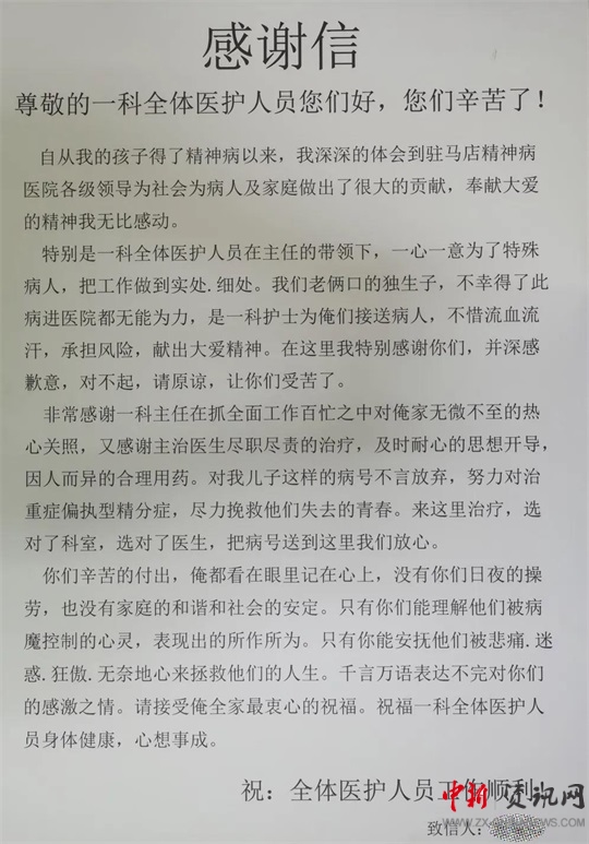 中新河南網(wǎng)駐馬店9月14日電(通訊員 楊云霞 周甜)近日,駐馬店市第二人民醫(yī)院精神一科患者張某的家屬帶著一封感謝信來到該院精神一科,感謝科室全體醫(yī)護人員在患者住院期間給予的無微不至的關懷與照顧。