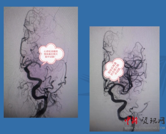 馮文獻(xiàn)立即披上沉重的鉛衣,為萬女士行腦動脈造影+取栓術(shù),術(shù)中造影顯示左側(cè)大腦中動脈完全閉塞,雙側(cè)大腦多發(fā)梗死。醫(yī)護(hù)團(tuán)隊(duì)以最快的速度抽吸取栓兩次,萬女士逐漸清醒,右側(cè)肢體功能障礙明顯改善。