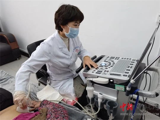 醫(yī)務(wù)人員為譚園村村民做B超檢查