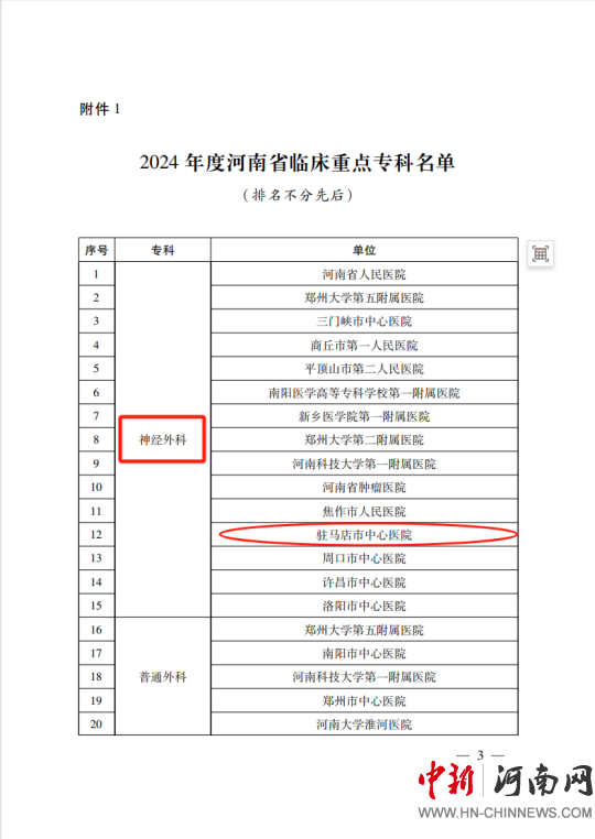 中新河南網(wǎng)駐馬店1月6日(通訊員:吳靖 孫玉瑩)近日,河南省衛(wèi)生健康委下發(fā)了《關(guān)于公布2024年度河南省臨床重點專科及特色?泼麊蔚耐ㄖ,駐馬店市中心醫(yī)院神經(jīng)外科、呼吸內(nèi)科獲批河南省臨床重點專科;重癥醫(yī)學(xué)科獲批河南省臨床重點培育?啤