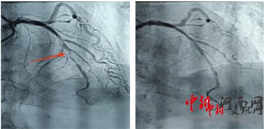 造影結(jié)果顯示,前降支中段次全閉塞。經(jīng)過充分預(yù)處理病變后,應(yīng)用一枚藥物球囊進(jìn)行治療。隨后,患者癥狀明顯緩解,生命體征恢復(fù)平穩(wěn),送入重癥監(jiān)護(hù)室進(jìn)行過渡觀察。