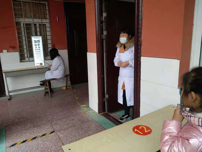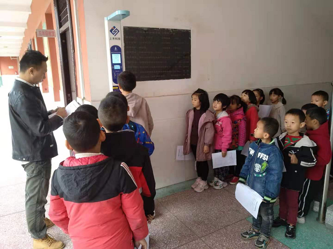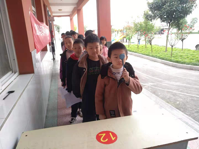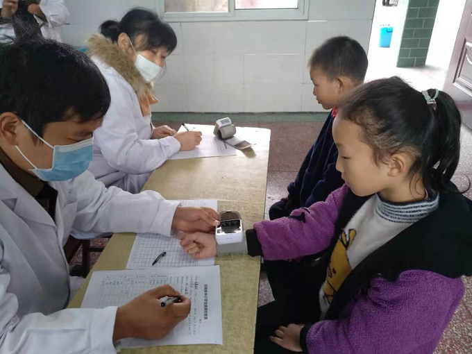 上午9點多,醫(yī)療隊來到王營小學,校長王強上前熱情迎接。醫(yī)生們剛剛到達,馬上從車搬下各種檢測儀器,在教學樓一樓走廊指定場地展開,接通電源,調試儀器,進行事前準備工作。從一年級到六年級包括大班和小班,各班學生在班主任帶領下,每人手持一張體檢情況登記表,依次排隊來到各個檢查口前,逐一分項進行檢查。