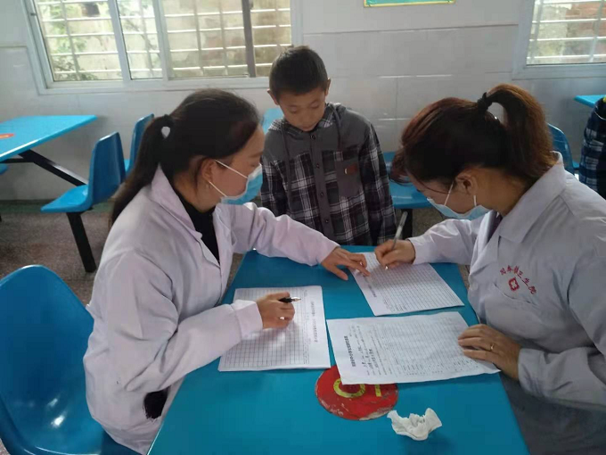 醫(yī)生和護士們按照各自的分工進行相應的檢查工作,學生們排成長隊,挨個進行檢查。檢查項目從形體指標的身高、體重,機能指標的血壓,內科常規(guī)的心、肺、肝、脾,眼科的視力、沙眼、結膜炎,到外科的頭、頸、胸、脊、四肢、淋巴結等一項一項細致檢查,在檢查表上一欄一欄認真填 寫。老師和學生們都稱贊醫(yī)護人員工作認真細致。