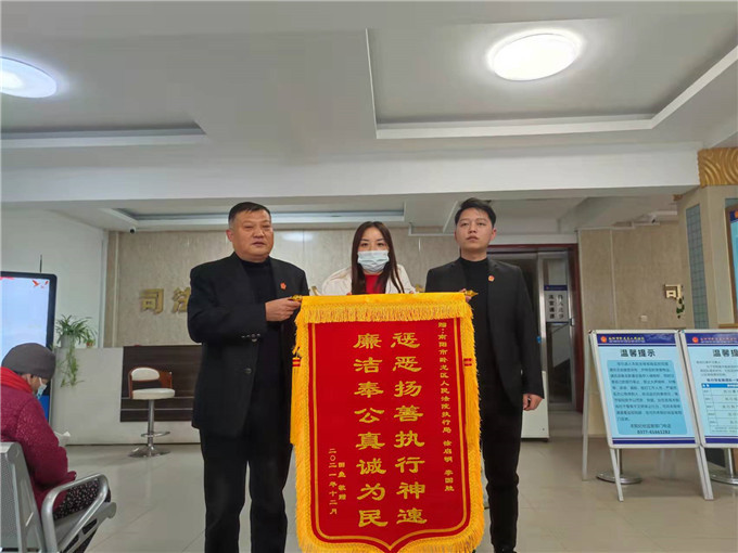 中新河南網(wǎng)12月15日電(李克選 魏錁 張冠)“真是太感謝你們了,拖了這么久的錢(qián)終于要回來(lái)了!”12月15日上午,申請(qǐng)執(zhí)行人田某專(zhuān)程來(lái)到南陽(yáng)市臥龍區(qū)人民法院,將一面印有“懲惡揚(yáng)善執(zhí)行神速 廉潔奉公真誠(chéng)為民”的錦旗送到執(zhí)行干警徐啟明的手中,感激的說(shuō)道。