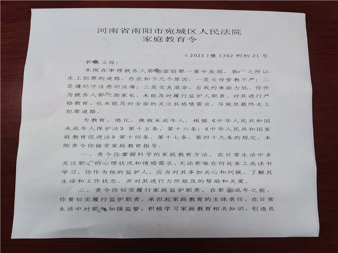 16歲少年屢次盜竊且敲詐勒索他人 南陽(yáng)宛城法院對(duì)其父母發(fā)出《家庭教育令》