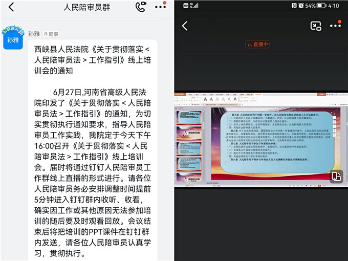 中新河南網(wǎng)7月21日電(李克選 何莉 王晶雅)為深入貫徹落實(shí)河南省高級(jí)人民法院印發(fā)的《〈人民陪審員法〉的工作指引》(以下簡(jiǎn)稱《工作指引》),持續(xù)推進(jìn)人民陪審員工作規(guī)范化,提升人民陪審員履職能力和參審水平,7月21日下午,西峽縣人民法院組織該院160名人民陪審員進(jìn)行集中培訓(xùn)。結(jié)合疫情防控政策,此次培訓(xùn)通過(guò)釘釘會(huì)議線上直播形式進(jìn)行,因故無(wú)法參訓(xùn)人員可以通過(guò)回看直播形式進(jìn)行補(bǔ)訓(xùn),以確保培訓(xùn)全覆蓋。