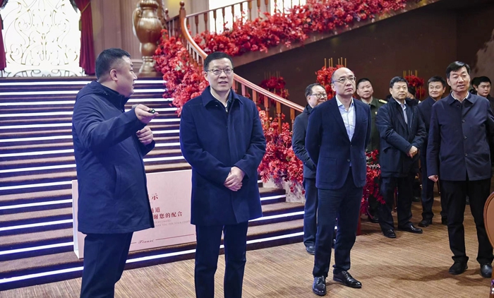 中新河南網(wǎng)12月6日電(任錢坤) 全息光影宴會廳更換場景只需一鍵切換,就能打造出不同場景,簡單的軟裝搭配光影效果,立刻呈現(xiàn)出風格迥異的視覺畫面。11月30日下午,在河南省漯河市源匯區(qū)天禧宴會藝術(shù)中心,由漯河市委書記秦保強帶隊開展的重點項目觀摩活動現(xiàn)場,隨著燈光閃爍實現(xiàn)一廳多變,多種色系的婚禮宴會廳通過不同燈光渲染切換出各種場景,讓觀摩人員沉浸式體驗到了夢幻魅力。