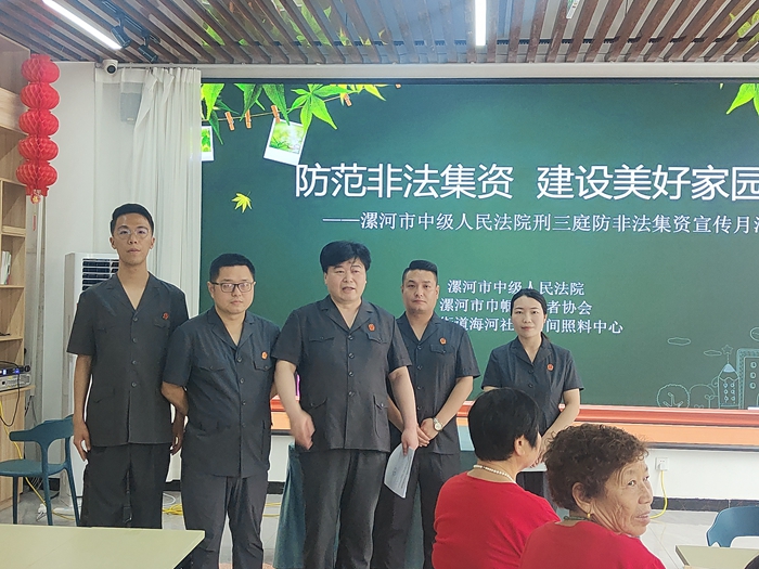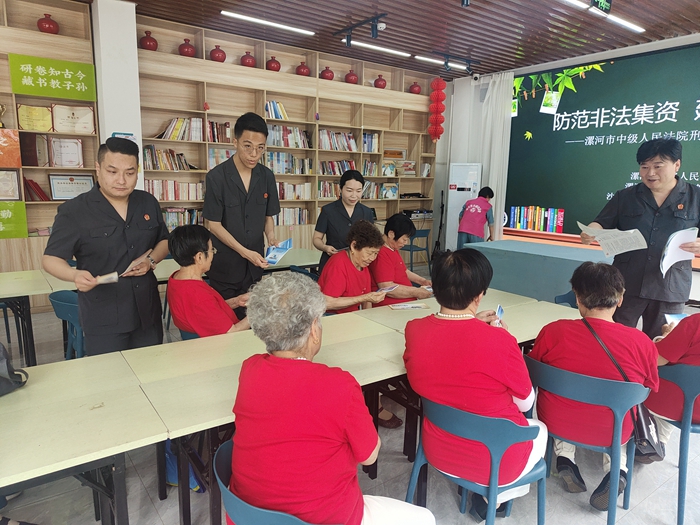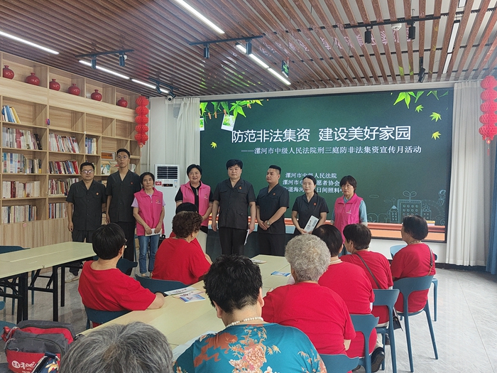 中新河南網(wǎng)6月4日電(任錢坤)隨著生活水平的提高,老年群體也逐漸從傳統(tǒng)消費(fèi)向服務(wù)型消費(fèi)拓展。各類會損害老年人合法權(quán)益的違法犯罪行為屢見不鮮,為增強(qiáng)轄區(qū)老年群體對集資詐騙的防范意識,提高自我保護(hù)能力,6月4日下午,河南省漯河市中級人民法院聯(lián)合漯河市巾幗志愿者協(xié)會、沙北街道海河社區(qū)日間照料中心舉行“防范非法集資建設(shè)美好家園”主題宣傳活動。