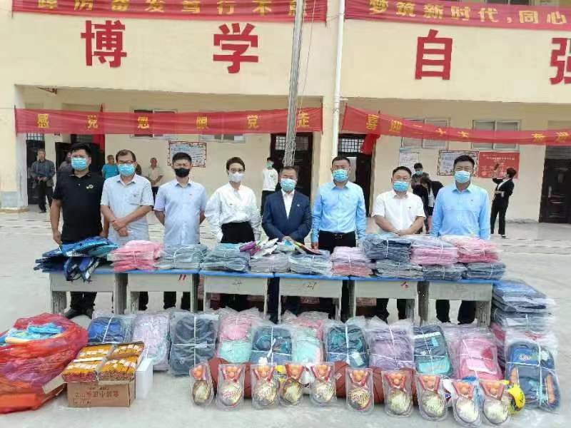 新聯(lián)會代表們來到虞城縣聞集鄉(xiāng)八里井小學(xué),將書包、文具盒、鉛筆、籃球、排球、足球、羽毛球拍、乒乓球拍、跳繩、國旗等文體用品送到全體師生手中。