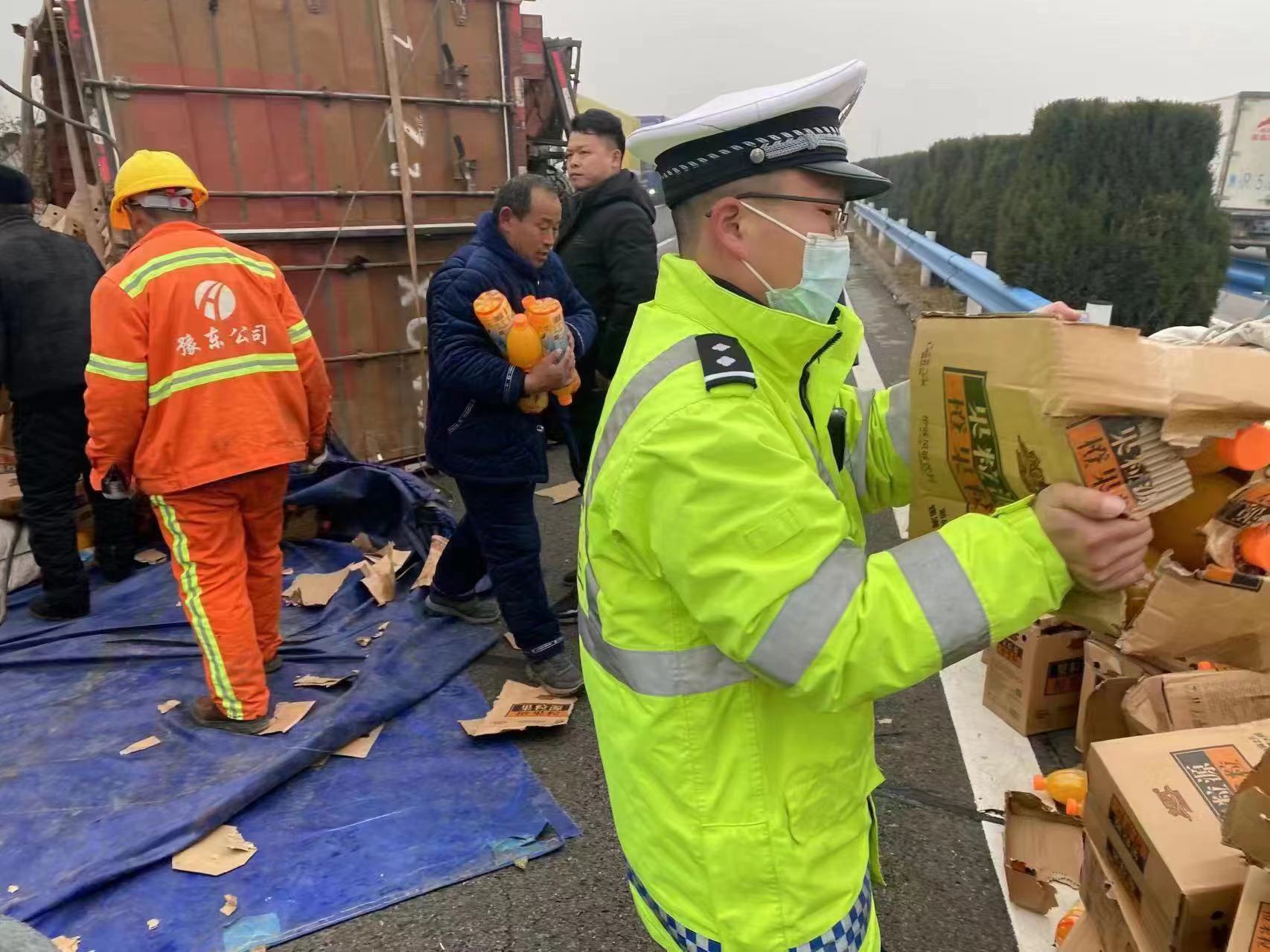 接警后,八中隊副中隊長王浩楠帶領(lǐng)中隊隊員火速趕赴現(xiàn)場,同時通知路政及救援車輛前來增援。民警到達(dá)現(xiàn)場后發(fā)現(xiàn),民警看到翻到在路面上,到處滾滿了飲料,如果不及時處置,存在著較大的交通隱患。此時,過往車流滾滾,飲料散落的到處都是,司機只要稍有不慎,極易發(fā)生二次事故。如何將這么多的飲料短時間內(nèi)收集轉(zhuǎn)運,減少車主的損失,快速恢復(fù)通行,迫在眉睫。民警當(dāng)即安排巡邏車輛在后方做好警戒,對現(xiàn)場進(jìn)行處置,避免二次事故的發(fā)生。