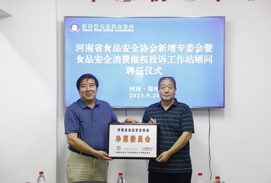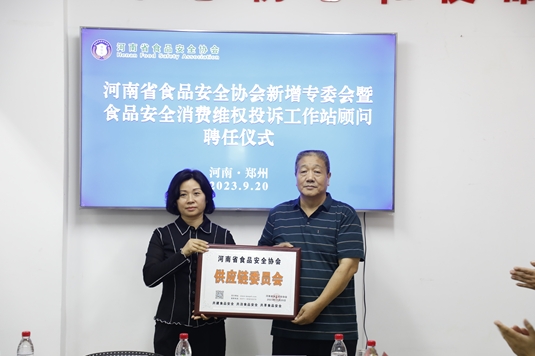河南省食品安全協(xié)會大家庭再添新成員,新成立3個專業(yè)委員會,分別是:凈菜委員會,主任許力;供應鏈委員會,主任曹艷君;地方特色食品委員會,主任李娜。河南省食品安全協(xié)會會長齊天生分別為三位主任頒發(fā)了牌匾。