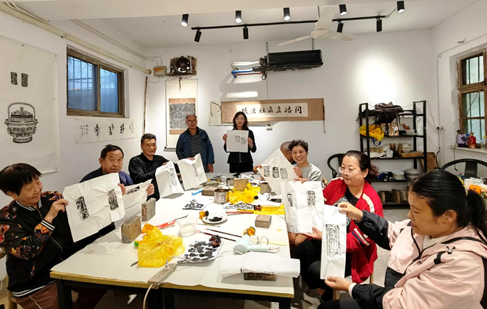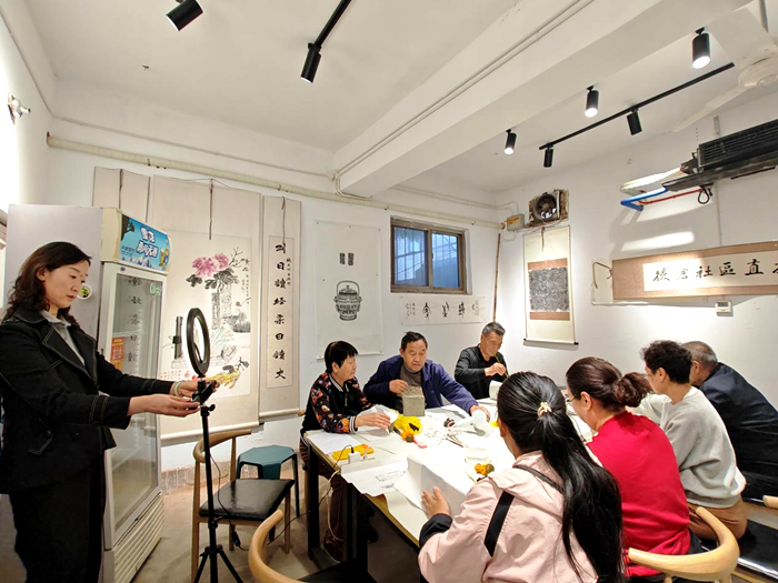 近日,后倉(cāng)街社區(qū)為了更好的利用直播間優(yōu)化商戶服務(wù),來(lái)到倉(cāng)巷街商戶佳泉文化工作室,和商戶負(fù)責(zé)人蘇偉老師共同分享后倉(cāng)街社區(qū)直播間。該商戶是中國(guó)傳統(tǒng)技藝拓片傳習(xí)所。社區(qū)邀請(qǐng)轄區(qū)居民文化愛(ài)好者和我們一起,到直播間免費(fèi)學(xué)習(xí)拓片的制作過(guò)程。工作室古色古香,墻上掛滿了各種拓片作品,充滿了濃厚的文化氣息。通過(guò)后倉(cāng)街社區(qū)直播間,線上線下同時(shí)互動(dòng),學(xué)習(xí)拓片的來(lái)歷、制作方法及意義。轄區(qū)居民王有才現(xiàn)場(chǎng)談了自己的學(xué)習(xí)感受,不僅增長(zhǎng)了見(jiàn)識(shí),開(kāi)闊了眼界,同時(shí)弘揚(yáng)了中國(guó)傳統(tǒng)文化技藝,對(duì)佳泉文化工作室有了更新更深的了解認(rèn)識(shí)。