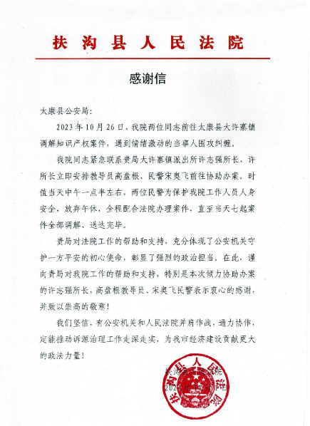“警法聯(lián)動(dòng)”扶溝法院向太康公安贈(zèng)送錦旗和感謝信
