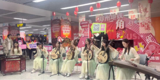 11月18日下午4時,一場匯集了《聲聲慢》《煙雨行舟》《赤伶》等優(yōu)秀作品,融合了歌唱、器樂、舞蹈等元素的“快閃”活動在人流如織的紫荊山地鐵站音樂角精彩上演。非洲鼓、小提琴、古箏、中阮等多種樂器獨特的音色,加之娓娓動聽的演唱及輕盈優(yōu)美的舞姿,不僅凸顯了工貿(mào)學子扎實的功底,更加展現(xiàn)了青春亮麗的色彩,吸引了眾多過路群眾駐足觀看。在地鐵的轉角與高雅藝術撞個“滿懷”,這場不期而遇的邂逅,令所有大飽耳福的市民從驚喜到感動,從傾聽到合唱,從觀看到律動,表演者與市民共同感受音樂帶來的歡樂。