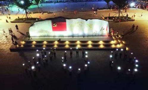 宣誓結(jié)束隊(duì)員們掏出手機(jī)打開燈光,放在頭上,排列成鐮刀和斧頭的樣式,而后又排成了100的字樣,象征著建黨100周年。無人機(jī)航拍下了這狀觀的一暮,得到了到公園夜游的圍觀市民的一致贊揚(yáng)。很多人手機(jī)拍照轉(zhuǎn)發(fā)。