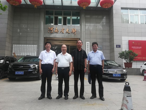 淅川范蠡研究會(huì)考察組與河南省民間文藝家協(xié)會(huì)秘書長(zhǎng)劉炳強(qiáng)(左二)在河南省文聯(lián)門前合影