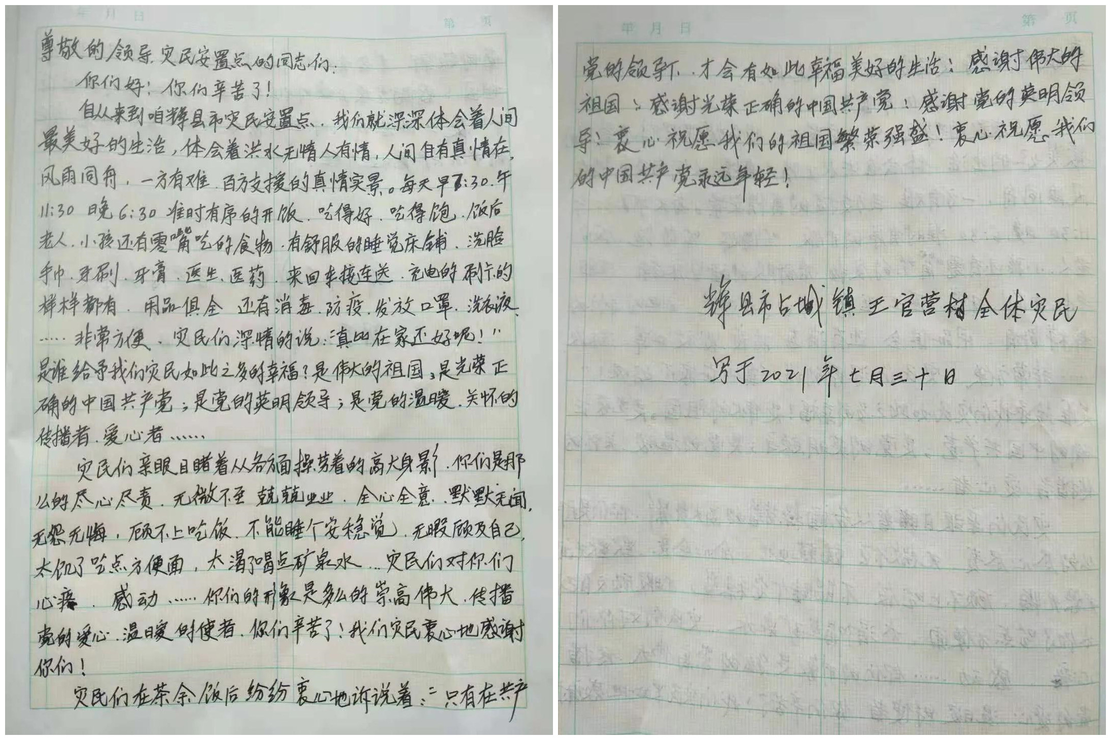 寫這封信的是受災(zāi)群眾安置點(diǎn)的陳金鳳老人,她今年75歲,黨齡56年。她的家在輝縣市占城鎮(zhèn)王官營(yíng)村,是這次受災(zāi)比較嚴(yán)重的鄉(xiāng)鎮(zhèn)之一。今天上午做完核酸檢測(cè)后,他們和另外一個(gè)村的群眾就要先回家了。臨別之際,陳金鳳老人將一封親手書寫的感謝信交給了高世陽(yáng)。