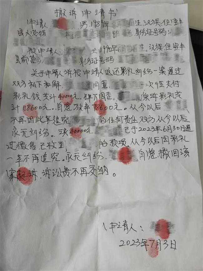 案件受理后,承辦法官與雙方幾番溝通,確認(rèn)二人感情破裂、無和好可能情形后,從雙方交往情況、共同生活時間、來往轉(zhuǎn)賬明細(xì)、本地風(fēng)俗習(xí)慣等方面綜合考量,向雙方釋法明理,充分講解民法典相關(guān)規(guī)定,促使雙方就返還彩禮數(shù)額達成一致。最終,被告王某向原告孫某返還彩禮款40000元、退還“三金”首飾,原告孫某申請撤訴,兩家矛盾就此化解。