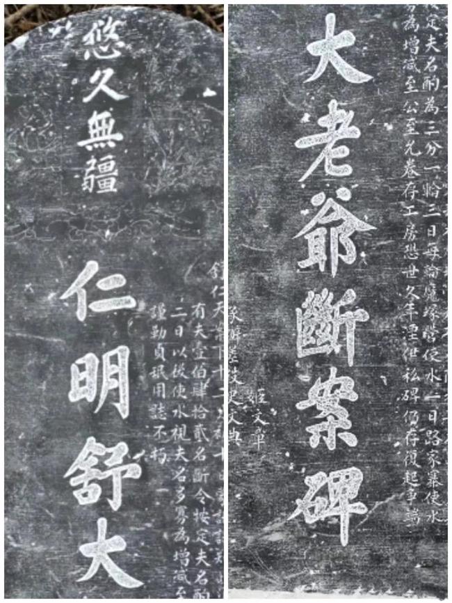碑文分左中右三個部分,上下書寫、自右向左排列,中間字體較大:“悠久無疆仁明舒大老爺斷案碑”;右邊是主文,列明當(dāng)事人、案由及判決結(jié)果:“汝旁舊有重修渠一道魔塚營路家寨兩村居民均食其利輪流灌溉毫無爭執(zhí)同治甲戌路家寨霸水偏澆七月間復(fù)又私捏碑文因控舒仁天案下十二月初十日蒙訊詰知此渠共夫貳伯零玖名魔塚營現(xiàn)有夫陸拾柒名路家寨現(xiàn)有夫壹伯肆拾貳名斷令按定夫名酌為三分一輪三日每輪魔塚營使水一日路家寨使水二日以後使水視夫名多寡為增減至公至允卷存工房恐世久年湮伊私碑仍存復(fù)起爭端謹(jǐn)勒貞瑉用誌不朽”;左邊是尾部,列明辦案者和時間:“承辦差役姬文章史文典焦泮大清同治拾叁年歲次甲戌十二月穀旦”。