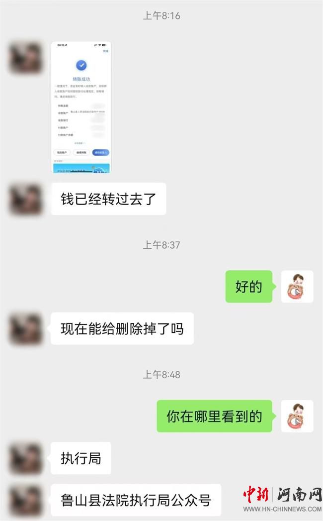 中新河南網(郭智遠 趙銘翼)“法官,能不能把我的執(zhí)行懸賞公告刪除了,我現(xiàn)在就把錢給你轉過去,太丟人了!”11月6日,魯山縣法院順利執(zhí)結一起贈與合同糾紛案件,切實保護了申請人的合法權益,維護了司法權威。