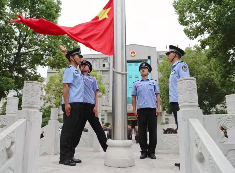 上午8時(shí),升旗儀式開始,院國旗護(hù)衛(wèi)隊(duì)邁著鏗鏘有力的步伐走向升旗臺(tái),伴隨著雄壯的《義勇軍進(jìn)行曲》,鮮艷的五星紅旗冉冉升起,迎風(fēng)飄揚(yáng),全體干警莊嚴(yán)肅立,向國旗行注目禮。