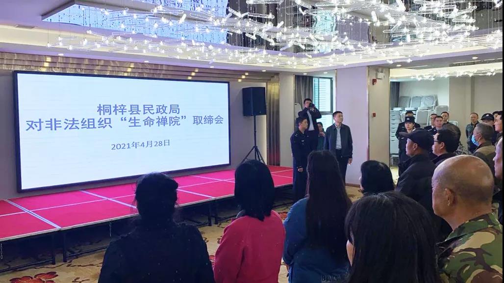 因“生命禪院”非法組織未經(jīng)登記、備案,擅自以社會團體名義開展活動,桐梓、安龍兩縣民政部門依據(jù)《社會團體登記管理條例》《取締非法民間組織暫行辦法》的有關規(guī)定,對其依法取締,并于4月28日下午、29日上午分別向窩點內(nèi)成員宣讀了取締決定書。之后,各地公安機關及有關部門工作人員分批次將被裹挾人員帶回原籍,與家人團聚。