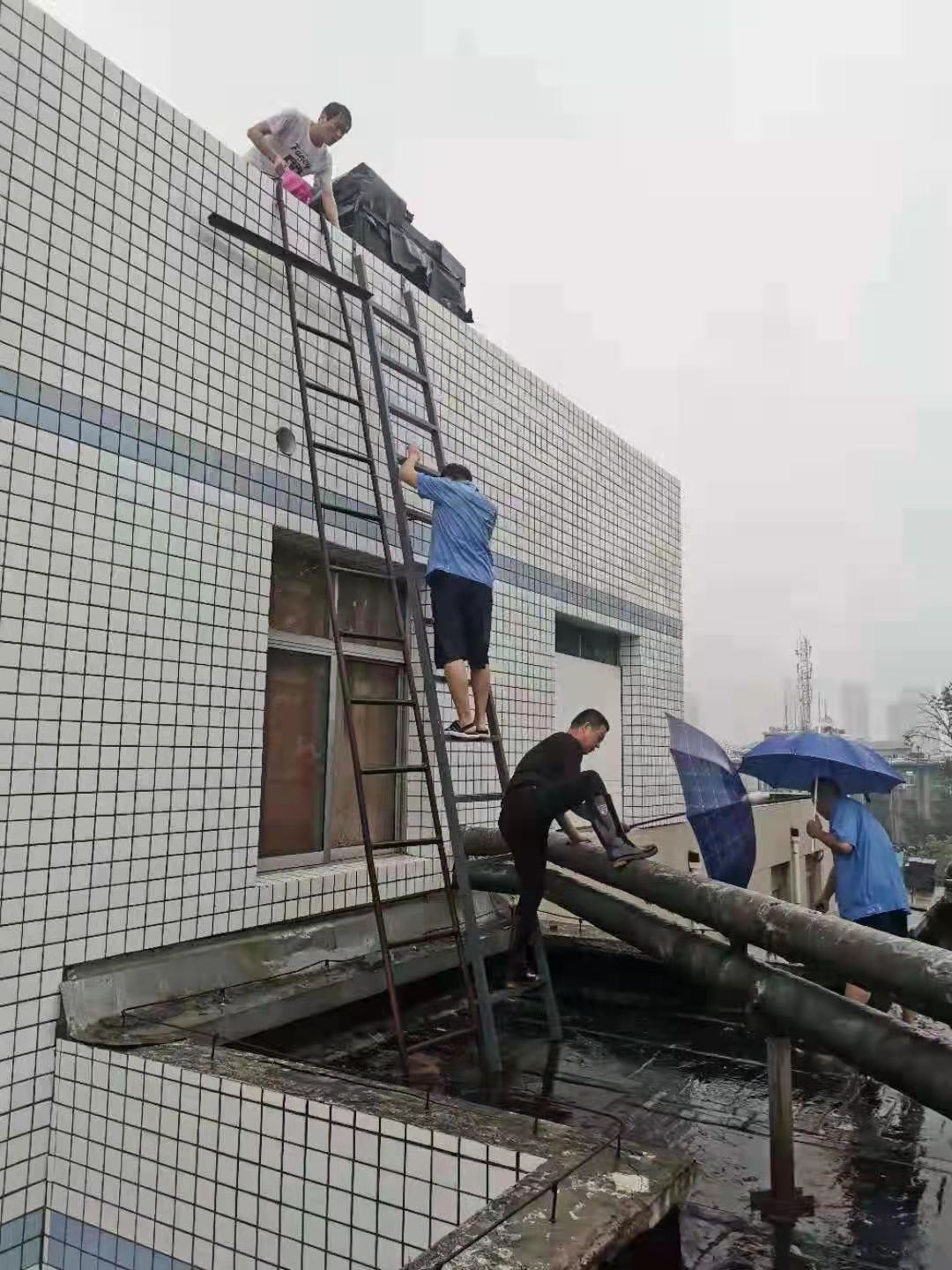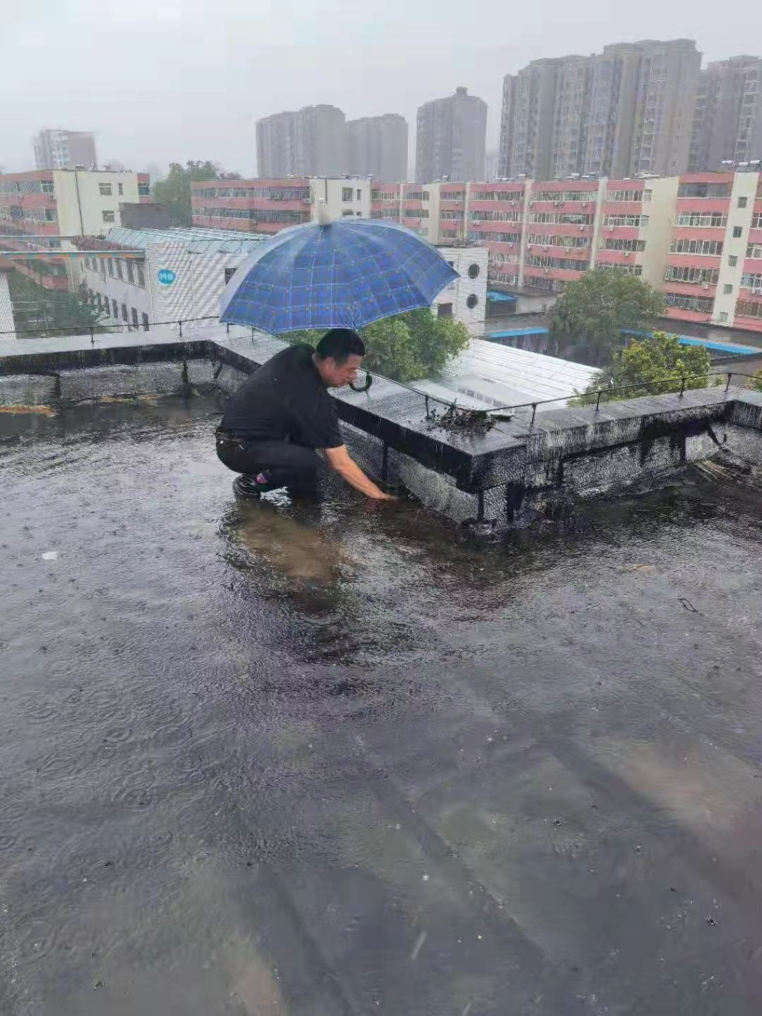 忙完休養(yǎng)人員轉(zhuǎn)移又接到放射科電話,科室樓頂一直在漏水,在趙偉河副院長的帶領(lǐng)下,他和大家火速趕到放射科,下水管已經(jīng)完全排不下去水,已經(jīng)威脅到醫(yī)療設(shè)備了。冒著暴雨,趙松廣同志艱難的爬到樓頂,直接拿著手邊的磚頭破開下水管道,讓水流出來,暫時解決了放射科的問題。忙完這些回到科里,衣服已經(jīng)濕透了,大家時不時打個寒顫,院領(lǐng)導(dǎo)讓倉庫值班人員送來了干衣服,全部人員換了之后,喝了口熱水,沒有休息,立刻前往地下查看醫(yī)院的中心配電室,做地下的防汛工作。搬沙袋擺沙袋,機(jī)械而枯燥的動作在這一刻充滿了意義,在所有人心中,為了醫(yī)院,再苦再累都值得。最后來到辦公樓,檢查辦公樓的漏水排水問題,搬運(yùn)沙袋,圍堵在辦公樓門口。連夜忙到凌晨一點多,看到醫(yī)院的險情被控制住了,才回去休息片刻。