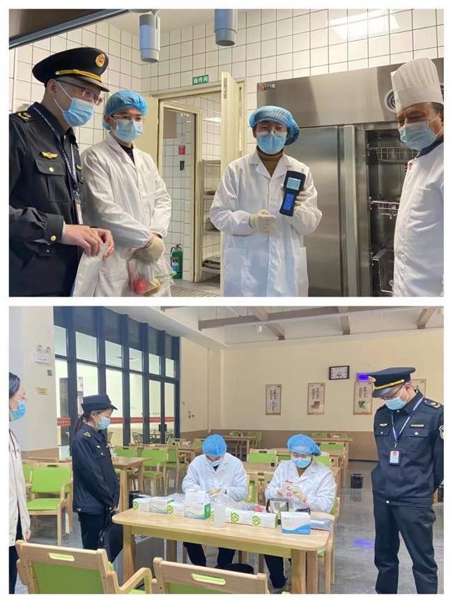 隨后,對食堂普遍關(guān)注的重點項目餐具潔凈度、蔬菜農(nóng)藥餐留、肉及肉制品類進行抽樣快速檢測,此次食品快檢共檢測樣品9個批次,檢測結(jié)果均顯示合格。
