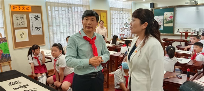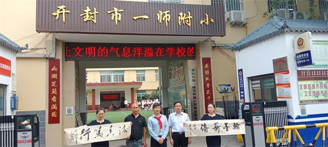 中新河南網(wǎng)(謝輝)漢字書法藝術(shù)是中華民族的瑰寶,行楷隸篆見功夫,墨香四溢校園香。開封市第一師范附屬小學(xué)為進(jìn)一步推進(jìn)素質(zhì)教育的全面實(shí)施,弘揚(yáng)中華優(yōu)秀傳統(tǒng)文化,培養(yǎng)學(xué)生書寫能力,提高文化品質(zhì)和審美能力,引導(dǎo)學(xué)生對中華漢字的認(rèn)同感,全力打造書香校園。2023年5月31日上午,一師附小開展以“書法傳承進(jìn)校園,翰墨飄香盡芬芳”為主題的書法名家進(jìn)校園活動(dòng)。應(yīng)邀開封市教育書法研究會(huì)會(huì)長史根之帶領(lǐng)開封大學(xué)工會(huì)辦公室主任毛成利、副秘書長賈風(fēng)偉蒞臨我校參加此次活動(dòng)。