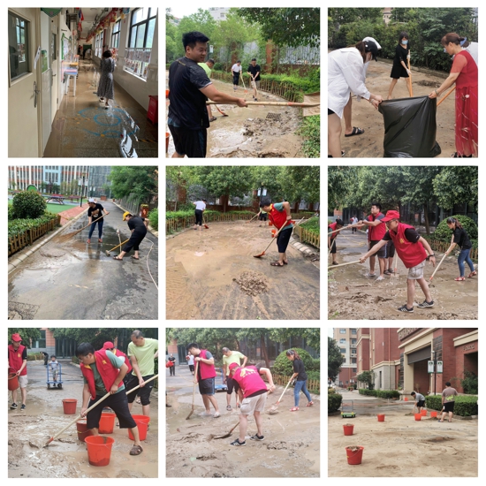 暴雨停歇,積水未退。眾多外小教師知道學(xué)校受災(zāi)之后,紛紛請(qǐng)戰(zhàn),大家克服困難、涉水逆行,奔赴學(xué)校,盡力所之能及,投入到美麗校園的恢復(fù)工作之中。21日至今,外小領(lǐng)導(dǎo)班子帶領(lǐng)志愿老師們清理被大雨沖塌的泥磚,整理被水浸泡的物品,消殺汛情過(guò)后的校園,排查下水管道是否堵塞、電路是否損壞,檢查地面是否有安全隱患,他們拿起鐵锨鏟泥沙,揮舞掃帚清積水。校園里停水?dāng)嚯姡顾敢律、淤泥濺到身上無(wú)法清洗,老師們雙手磨出了泡,卻無(wú)人叫苦、無(wú)人退卻。一幅幅感人的畫(huà)面,一個(gè)個(gè)泥濘的身影,踐行了外小人的初心使命。