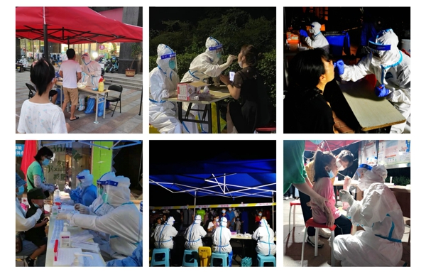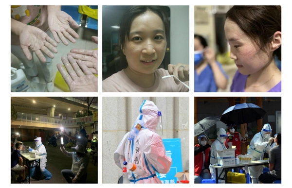 疫情當前,群眾也紛紛用自己的方式自發(fā)地為防疫盡一份力。一把為醫(yī)護人員揮動的搖扇;一輛市民自己改造的核酸檢測車;核酸檢測點突然停電而舉起的點點星光;一群深夜排隊等待做核酸檢測的爺爺奶奶;居民為醫(yī)務人員自制的冰塊馬甲;醫(yī)務人員背后悄悄舉起的遮陽傘……