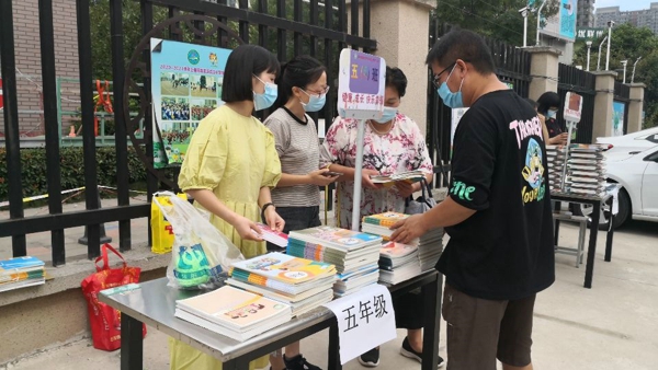 8月26日,二至六年級各班班主任結(jié)合小區(qū)分布和就近原則,通知各班3--5位家長代表,準(zhǔn)時來到學(xué)校領(lǐng)書地點。一大早,教務(wù)處和安保處現(xiàn)場指導(dǎo)教材發(fā)放與防疫工作,并維持現(xiàn)場秩序。家長代表全程佩戴醫(yī)用防護口罩,聽從各班班主任及安保人員的指揮,測溫消毒、有序領(lǐng)取教材,力爭最大限度避免人員接觸,做到即拿即走,不在學(xué)校逗留。提前發(fā)放教材,解決學(xué)生居家線上學(xué)習(xí)的需求,確保線上教學(xué)工作的順利、有效地開展。