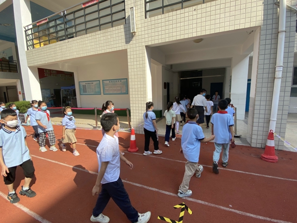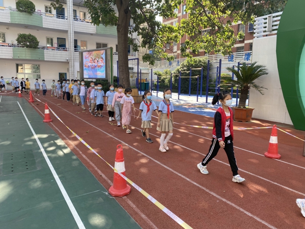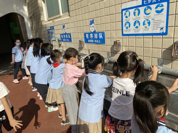 接著,各年級按照部署安排錯時演練,在班主任的帶領(lǐng)下,按照各年級各班的規(guī)定路線下樓如廁、洗手,上樓,學生們熟悉著閉環(huán)路線流程,一米距離的班隊有序安靜。