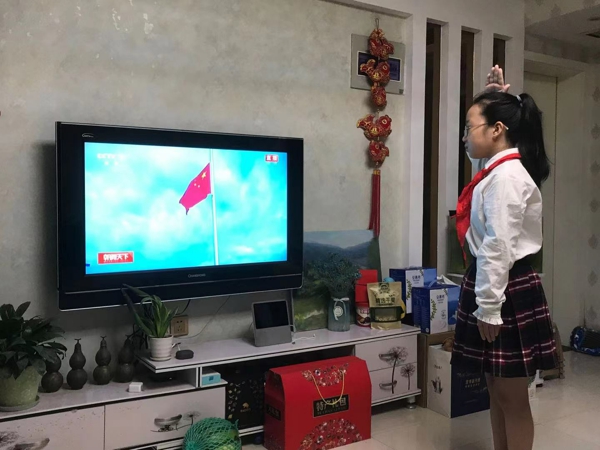 早上六點,隊員們穿戴整齊,莊嚴肅立的正站在電視屏幕前,隨著樂曲響起,國旗冉冉上升,每個隊員的心中感慨萬千,向著國旗表達著最崇高的敬意。五星紅旗訴說著新中國72年風云激蕩的光輝歲月,見證著一個文明古國屹立于世界東方的昂揚氣概。隊員們個個目光堅定,驕傲自豪。讓人不禁想到“生在國旗下,長在春風里”。