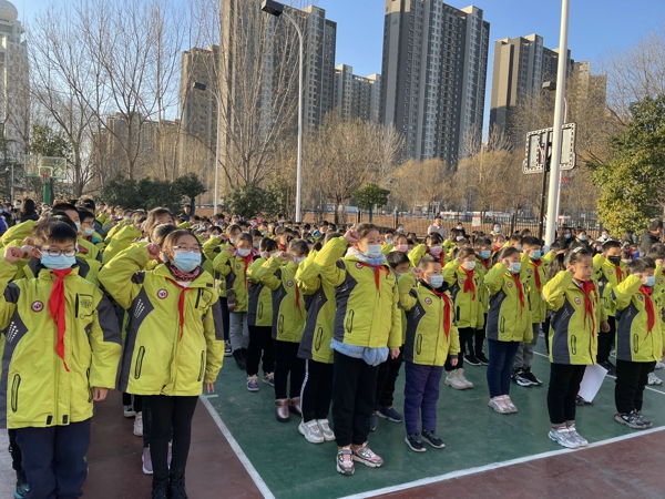 負(fù)責(zé)本次升旗儀式的是三六中隊(duì)。在雄壯的國(guó)歌聲中,鮮艷的五星紅旗徐徐升起,迎風(fēng)飄揚(yáng)。三六中隊(duì)的部分少先隊(duì)員朗誦了《歡慶元旦》,隊(duì)員們朗誦到:“在新的一年里,我們要更加努力學(xué)習(xí)本領(lǐng)。像戰(zhàn)士攻下一個(gè)個(gè)碉堡,我們要向知識(shí)的殿堂勝利進(jìn)軍。”隨后,三六中隊(duì)輔導(dǎo)員李哲老師做了《歡慶元旦筑夢(mèng)未來(lái)》主題講話,她告訴同學(xué)們:2022年是新的一年,新的一年新的開始,希望同學(xué)們珍惜時(shí)光,策馬揚(yáng)鞭,持之以恒,鍥而不舍,以飽滿的熱情迎接新的挑戰(zhàn),以不懈的追求完成優(yōu)秀的學(xué)業(yè)!同時(shí)她也告誡同學(xué)們,面對(duì)新的一年,新的挑戰(zhàn),要付出更加艱辛的努力,才能收獲累累碩果。