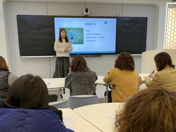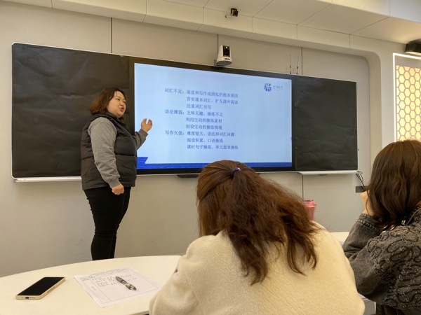 英語組骨干教師陳曦通過測評數(shù)據(jù)、問題成因和改進(jìn)措施三個方面對三、四年級上學(xué)期的測評結(jié)果進(jìn)行了深入淺出的分析。陳老師提出,一線教師要立足學(xué)情,在進(jìn)行課程設(shè)計(jì)時要體現(xiàn)語言的交際功能,關(guān)注學(xué)生思維品質(zhì)的培養(yǎng);要善用課外閱讀資源提升學(xué)生的學(xué)習(xí)興趣和語言感知能力。同時,陳老師結(jié)合自身的豐富經(jīng)驗(yàn)與大家分享了如何創(chuàng)設(shè)有意義的情境,使老師們受益匪淺。