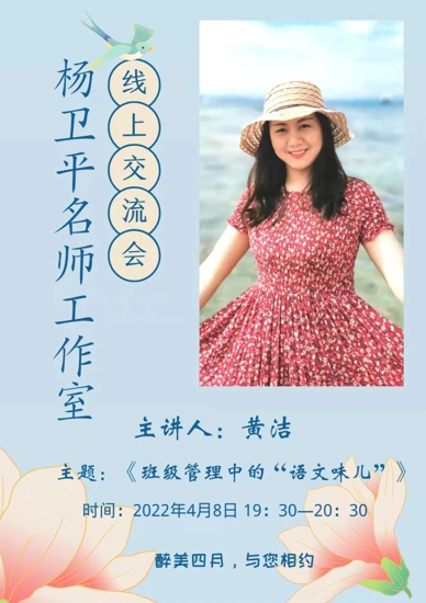 4月8日晚7:30,楊衛(wèi)平名師工作室本月線上研修活動(dòng)如期舉行,工作室核心成員黃潔老師跟大家分享了《班級(jí)管理中的“語(yǔ)文味兒”》主題講座,工作室所有成員認(rèn)真參與,積極交流感悟。