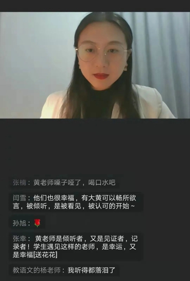 她氣質(zhì)溫婉、眉目如畫(huà),是我們心目中的最美教師;她教而有思、研而有方,是我們語(yǔ)文組的教研組長(zhǎng);她身體力行、愛(ài)生如子,是我們深情凝望的榜樣。第一次在開(kāi)車(chē)時(shí),全程聆聽(tīng)了黃老師的講座,導(dǎo)航的嘈雜絲毫不影響我的專注,因?yàn)樗诎嗉?jí)管理中注入的素養(yǎng)的養(yǎng)成,那是班級(jí)管理的深層文化;因?yàn)橛鲆?jiàn)更好的自己、笑草說(shuō)、一封信,追尋班級(jí)管理中的語(yǔ)文味;因?yàn)楸頁(yè)P(yáng)優(yōu)秀、正面引領(lǐng)、拉近師生關(guān)系,讓說(shuō)教變成了悅納。至今還想起,在教學(xué)評(píng)一體化培訓(xùn)時(shí),黃老師的發(fā)言讓我瞬間明白了語(yǔ)文教師應(yīng)具備的素質(zhì)和自己努力的方向。時(shí)常感念曾經(jīng)的指導(dǎo)與幫助,感恩于曾經(jīng)的相聚與今日的學(xué)習(xí),永遠(yuǎn)心懷感激!