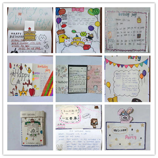 其中三年級英語以第四單元Atthezoo為主題,學(xué)生繪制了高矮胖瘦不同的動物,并介紹其長鼻子小眼睛等細(xì)節(jié)特征。四年級英語以Atmyfarm為主題,巧妙布局的同時加入蔬菜和動物等手繪圖片及英文單詞,同學(xué)們奇思妙想,呈現(xiàn)出一幅幅美輪美奐的農(nóng)場景象。五年級以"我的生日邀請函"為主題,學(xué)生們個個熱情高漲,充分展現(xiàn)了自己的繪畫天賦以及無限的創(chuàng)造力,學(xué)生們的作品制作精美,處處顯現(xiàn)著他們的用心。通過這次活動,學(xué)生們不僅學(xué)會了邀請函的書寫格式,也極大的激發(fā)了學(xué)生學(xué)習(xí)英語的興趣。