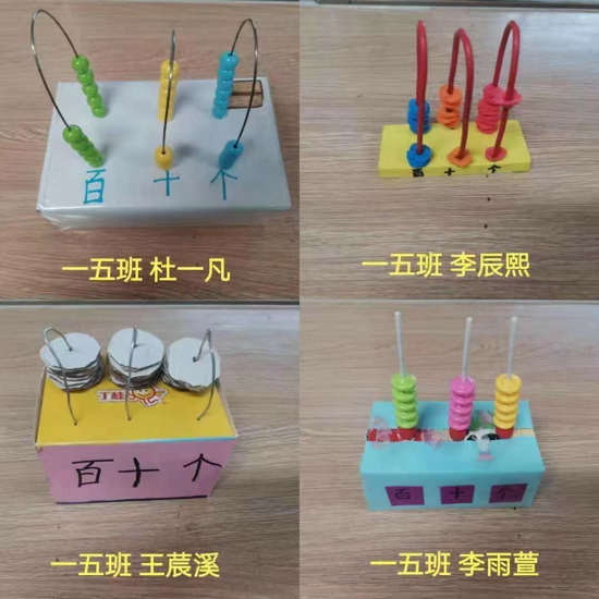 為了提高孩子的動(dòng)手能力,培養(yǎng)他們的創(chuàng)新思維,更好的讓孩子認(rèn)識100以內(nèi)的數(shù),一年級數(shù)學(xué)組開展了自制學(xué)具-----制作計(jì)數(shù)器的活動(dòng)。孩子們利用各種各樣的材料,變廢為寶,大膽設(shè)計(jì)。通過操作,學(xué)生初步理解個(gè)位、十位、百位的名稱和順序。讓孩子動(dòng)手操作,在計(jì)數(shù)器上撥出珠子,知道這些數(shù)是由幾個(gè)十和幾個(gè)一組成的。并說出同一個(gè)數(shù)在不同的數(shù)位上表示的意義。同時(shí)讓孩子讀出計(jì)數(shù)器上的數(shù),知道讀數(shù)和寫數(shù)都是從高位起。孩子們在制作中體會(huì)快樂,在快樂中收獲知識,真正做到了玩中學(xué),樂中學(xué)。