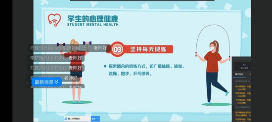 小龍寶們積極留言或連線,與各位班主任互動說出自己的心聲,如,“居家隔離期間,情緒總是很低落”“每天面對家長很多次嘮叨,心里很煩”“總是靜不下心進行自主學習”......還有龍寶分享自己愉悅身心的好辦法,可以給爸媽講故事、讀喜歡的繪本、跑步、學唱一首歌曲或者學跳一支舞,還可以做簡單家務、為父母做拿手的飯菜,和同學、朋友適當聊聊天,等等。班主任在線及時進行了心理疏導,并肯定了小龍寶們充滿陽光、態(tài)度積極的做法。