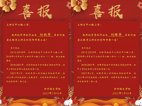 據(jù)了解,上街區(qū)中心路小學(xué)2018屆優(yōu)秀畢業(yè)生劉璨華、劉鎧華現(xiàn)就讀于鄭州北大培文學(xué)校,在北大培文初中部就讀期間弟弟劉璨華初中三年曾三次奪得上街區(qū)統(tǒng)考第一名,哥哥劉鎧華兩次奪得上街區(qū)統(tǒng)考第一名。2022年4月,弟兄兩人在河南省高一大聯(lián)考中分別奪得兩縣區(qū)(上街區(qū)和滎陽(yáng)市)第一名和第三名的驕人成績(jī)。