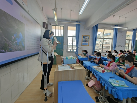 中新河南網(wǎng)5月20日電(吳勇強郭蘭蘭)近日,在鄭州市中原區(qū)百花藝術小學的科學課課堂上,一位女教師右腳打著石膏,卻仍然堅持給學生上課,引來了全體師生紛紛點贊,稱她為“最負責任的老師”。